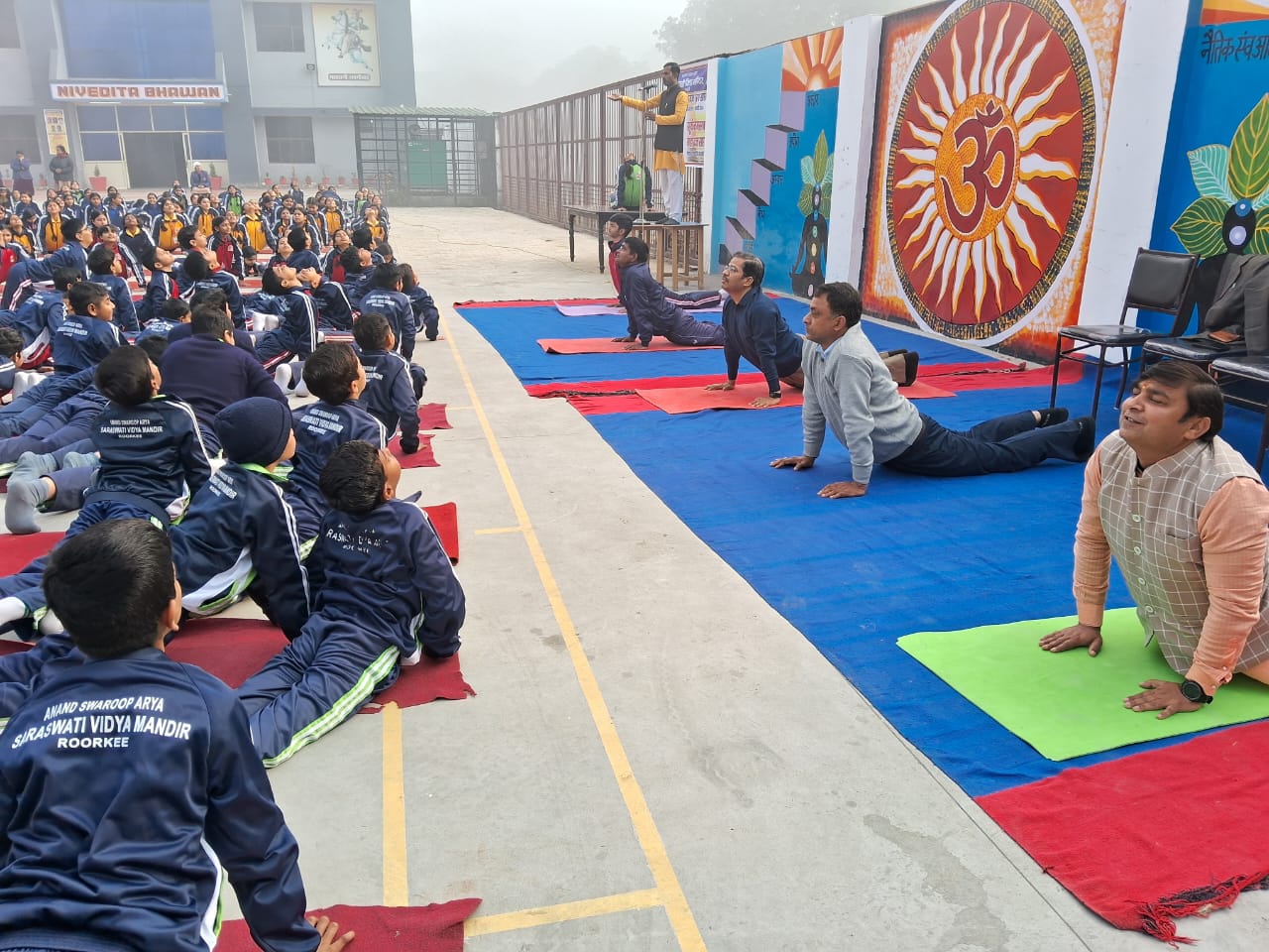 बड़े हर्ष का विषय है कि रूड़की के प्रतिष्ठित विद्यालय आनन्द स्वरूप आर्य सरस्वती विद्या मन्दिर में रथ सप्तमी के अवसर पर सूर्य नमस्कार महायज्ञ का साप्ताहिक आयोजन उत्साह एवं हर्षोल्लास के साथ किया गया। जिसमें कक्षा एक से बारहवीं के छात्र/छात्राओं समस्त शिक्षक शिक्षिकाओं, प्रबन्ध समिति एवं समस्त कर्मचारियों द्वारा सामूहिक सूर्य नमस्कार योग किया गया। सर्वप्रथम विद्यालय प्रबंधक ड़ाॅ0 रजत अग्रवाल, श्री आदर्श वीर भारद्वाज (सदस्य प्रबंध समिति) प्रधानाचार्य श्री अमरदीप सिंह, उपप्रधानाचार्य श्री मोहन सिंह मटियानी द्वारा माँ सरस्वती के चित्र के समक्ष दीप प्रज्जवलित कर पुष्पार्चन किया।